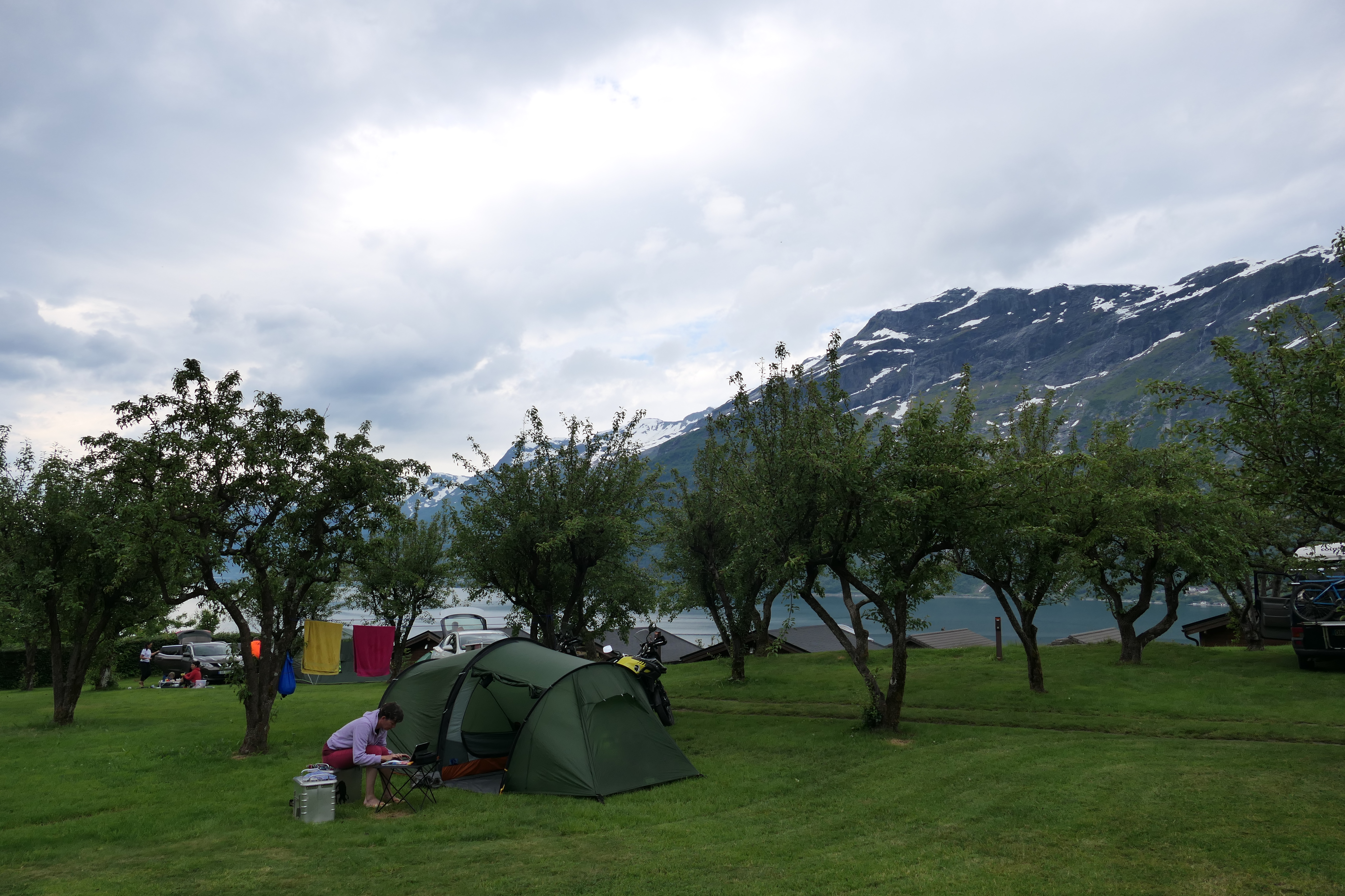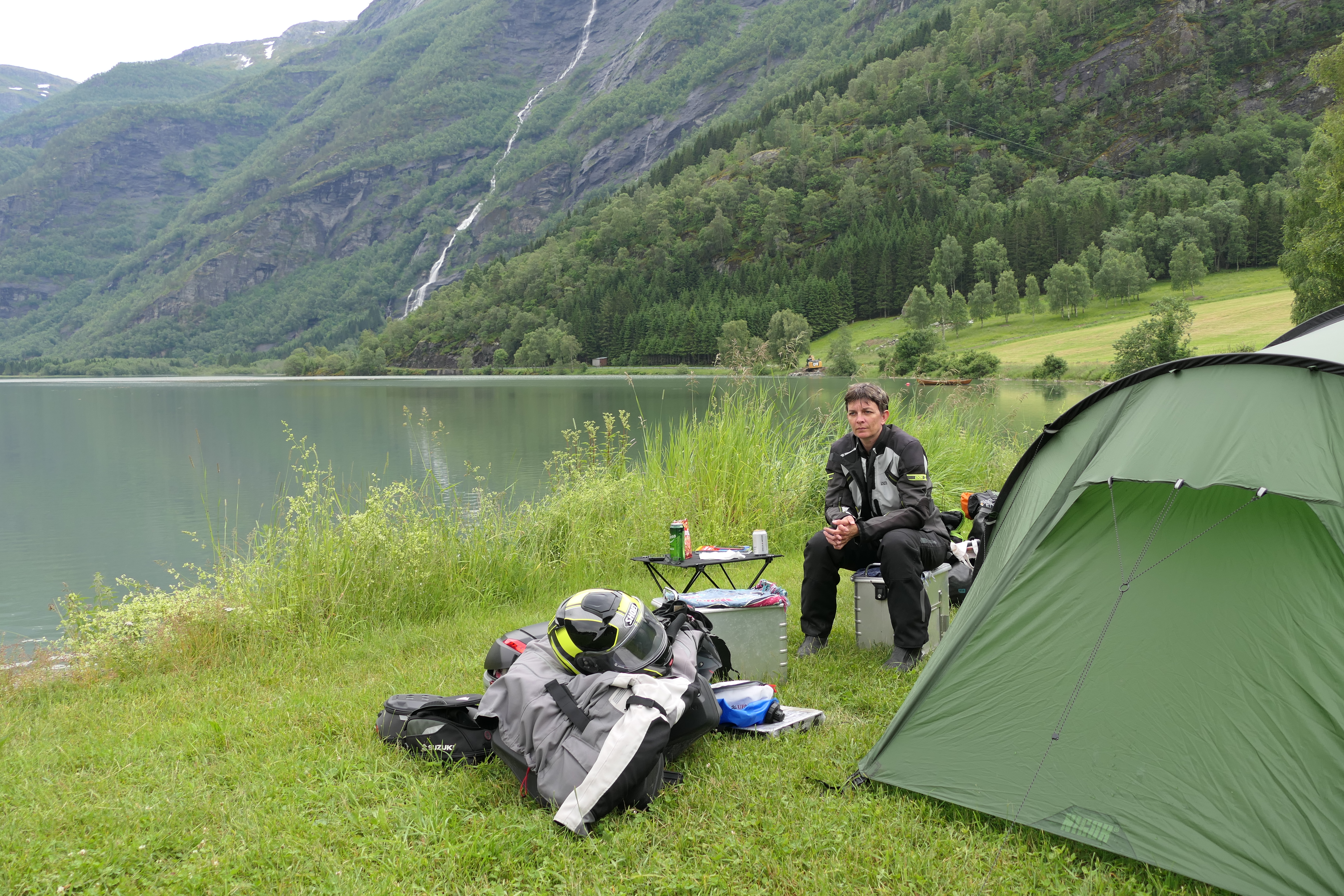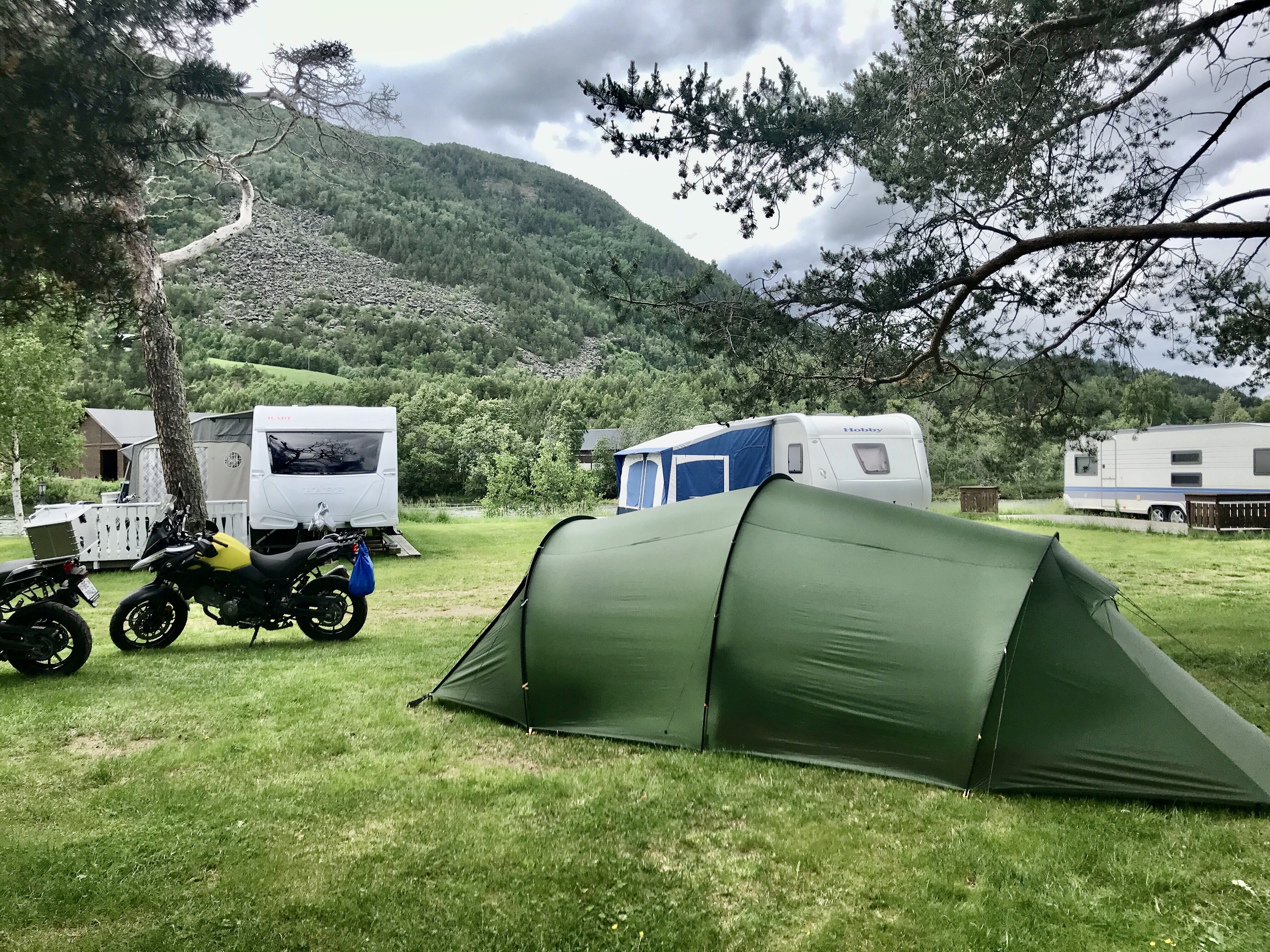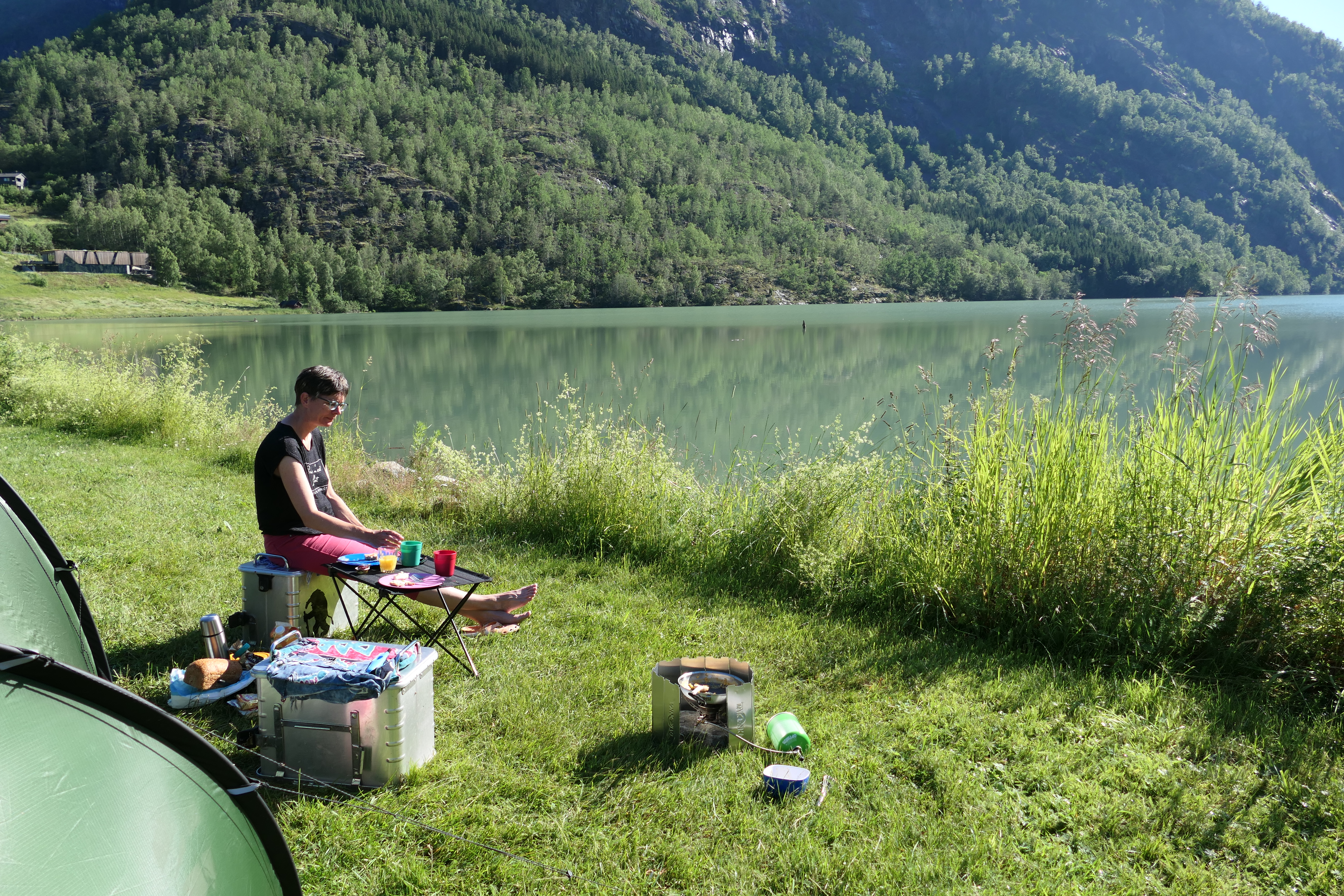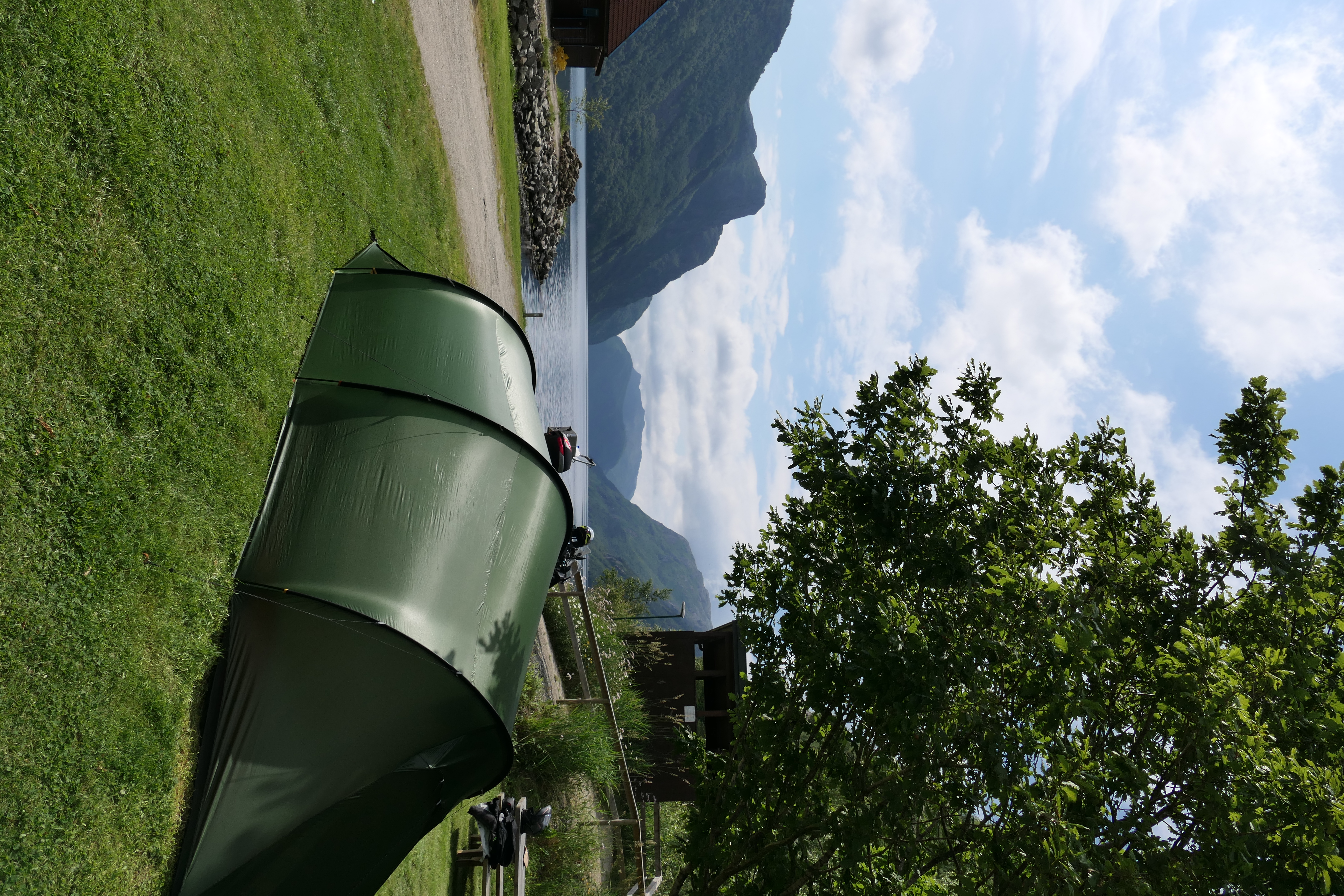 Heute wollten wir gemütlich im Städchen Skjolden einkaufen, aber dummerweise legte heute Morgen ein Mega-Kreuzfahrtschiff hier an und die Passagiere hatten genau zu diesem Zeitpunkt Landgang….. so schwirrten sie also wie 2-beinige Ameisen umher und wir gingen unverrichteter Dinge wieder zum Zelt und kauften später ein. Wir verbrachten den Nami mit lesen und genossen den schönen Campingplatz bei strahlendem Sonnenschein.