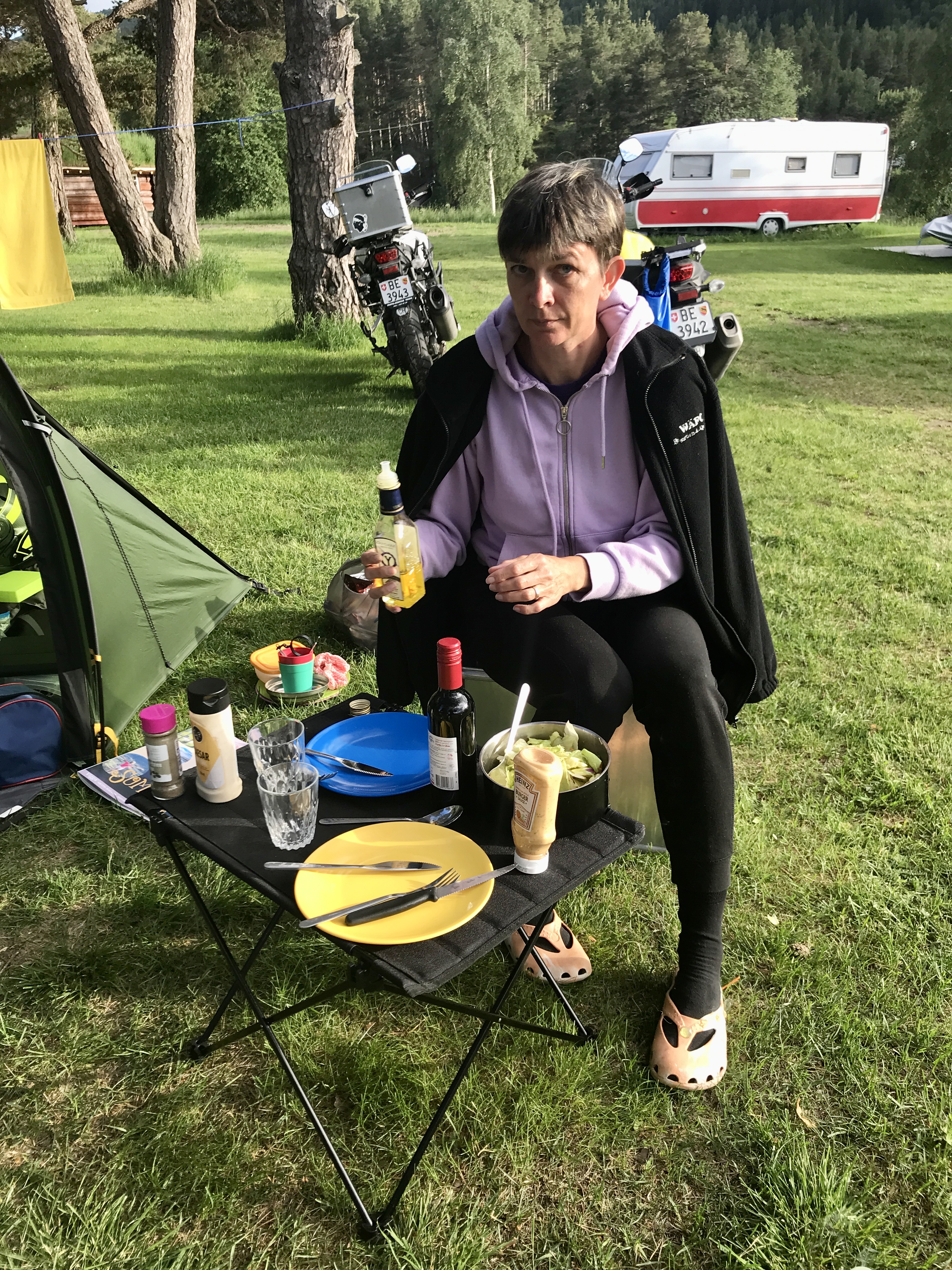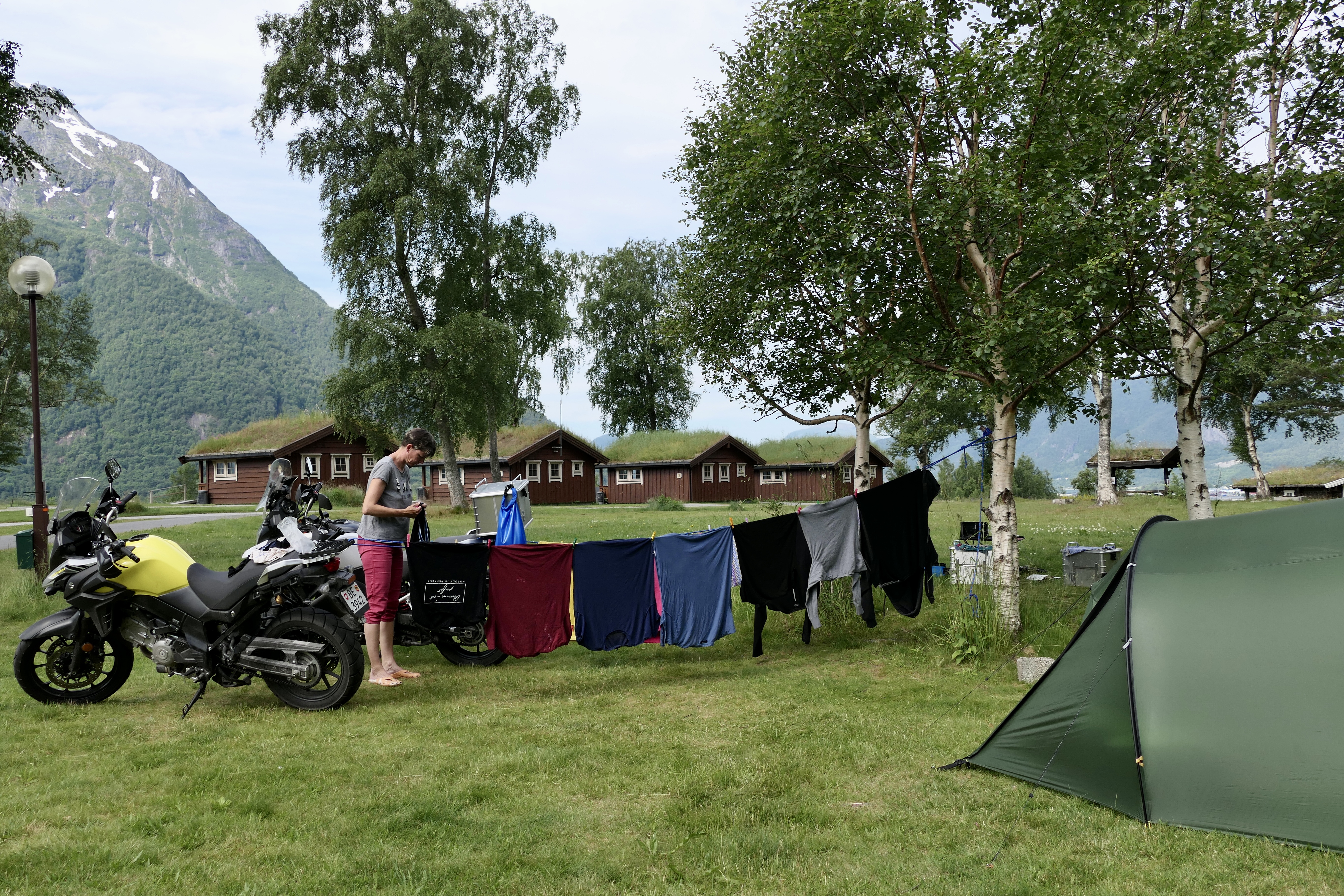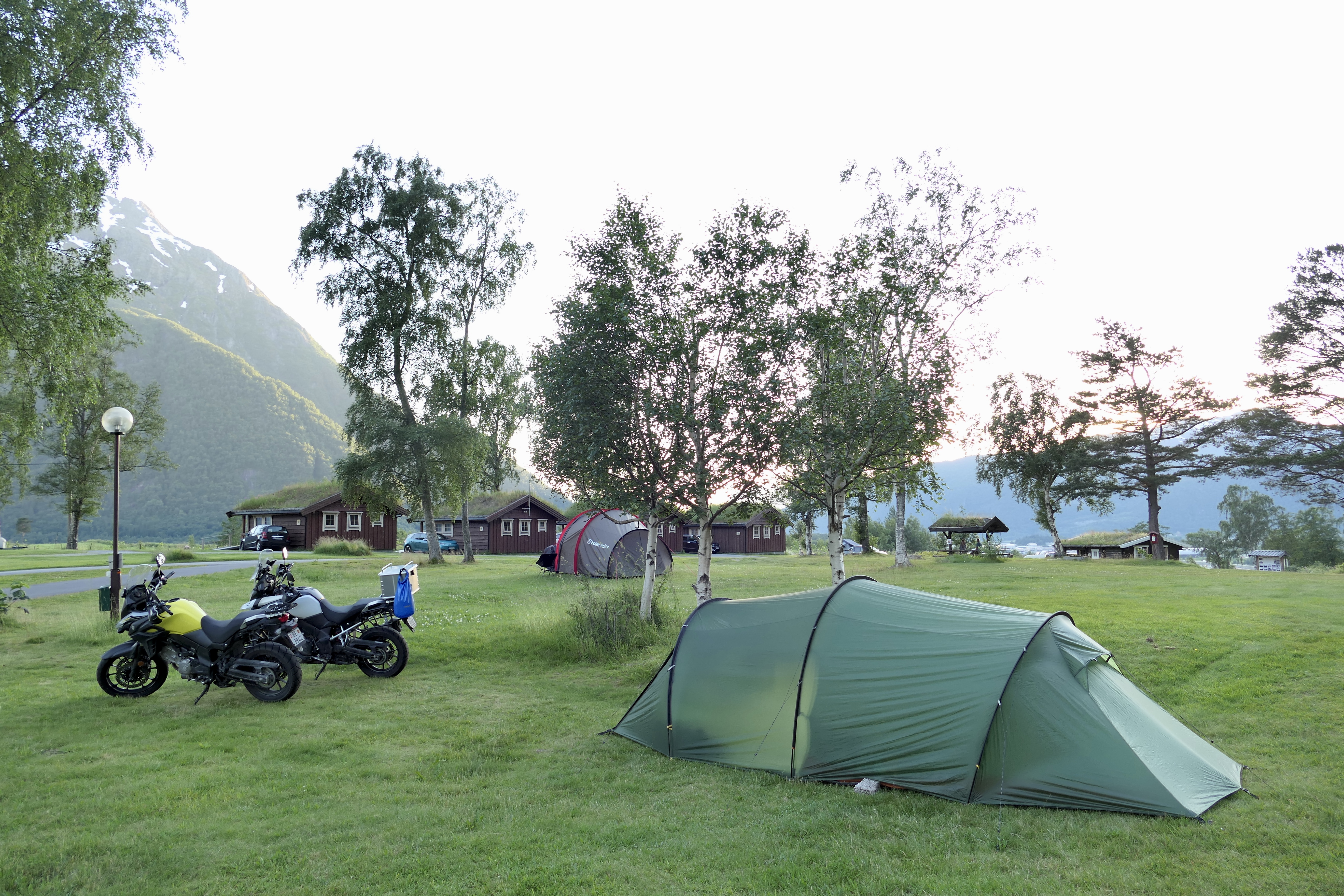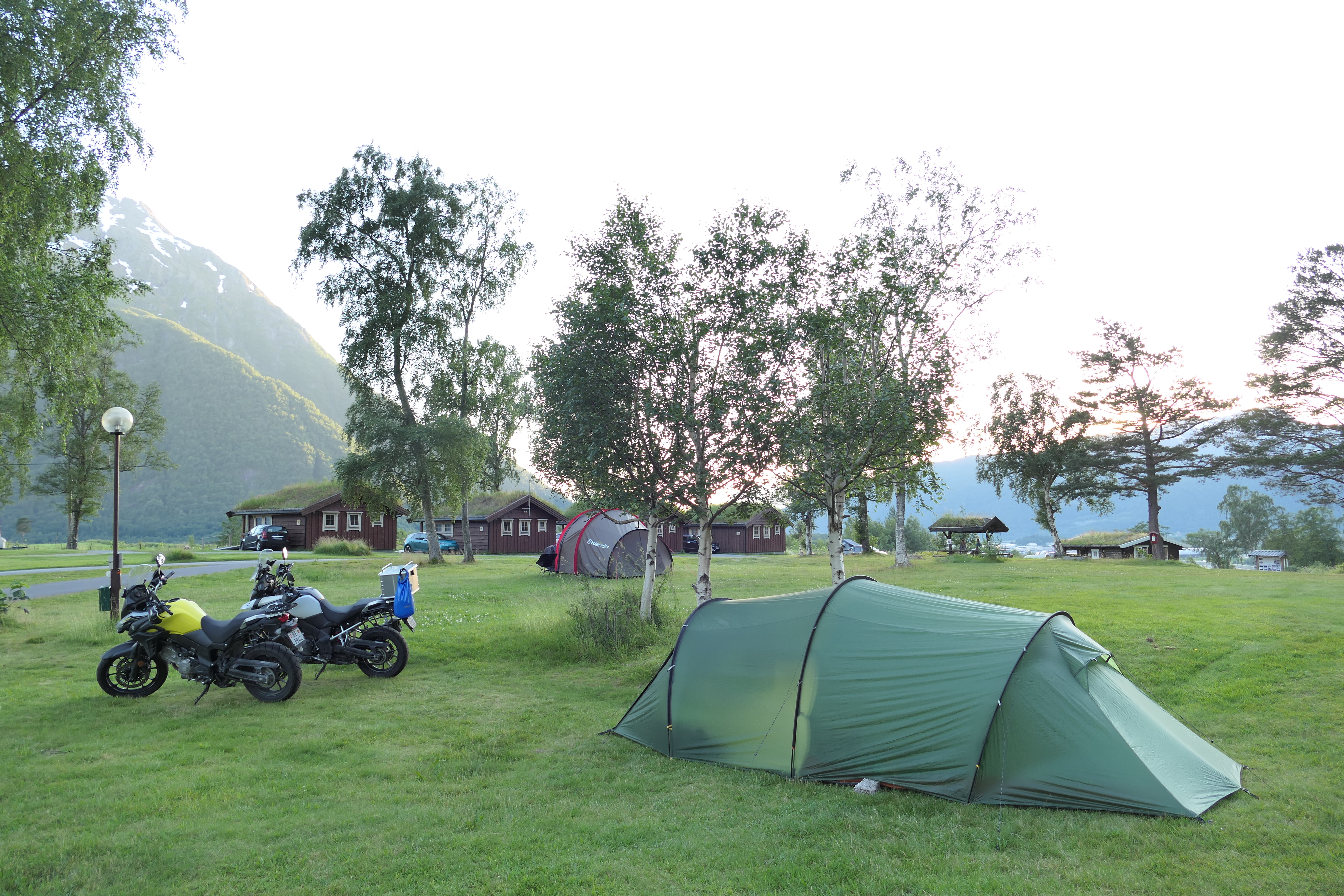 Heute wollten wir gemütlich im Städchen Skjolden einkaufen, aber dummerweise legte heute Morgen ein Mega-Kreuzfahrtschiff hier an und die Passagiere hatten genau zu diesem Zeitpunkt Landgang….. so schwirrten sie also wie 2-beinige Ameisen umher und wir gingen unverrichteter Dinge wieder zum Zelt und kauften später ein. Wir verbrachten den Nami mit lesen und genossen den schönen Campingplatz bei strahlendem Sonnenschein.