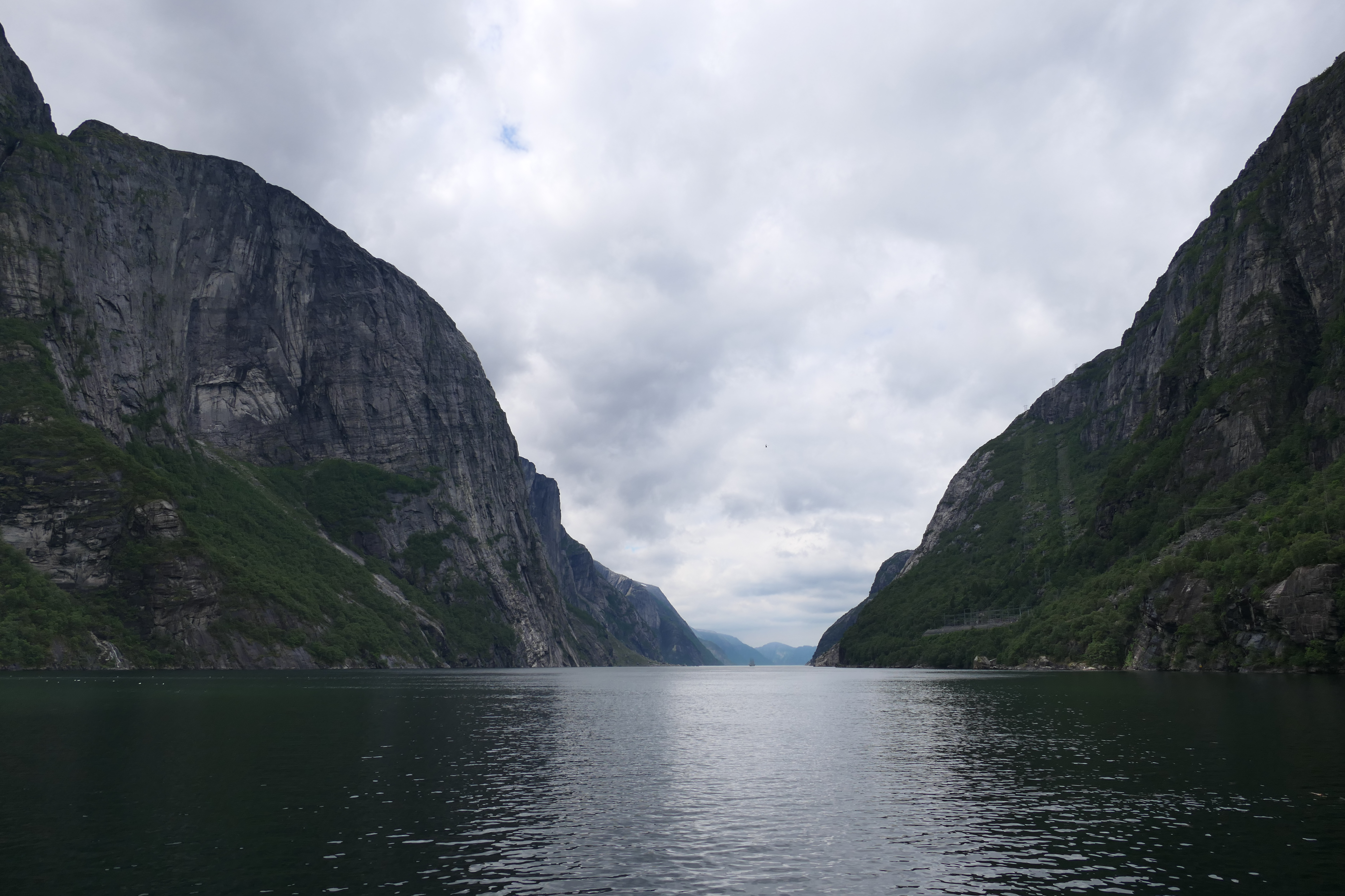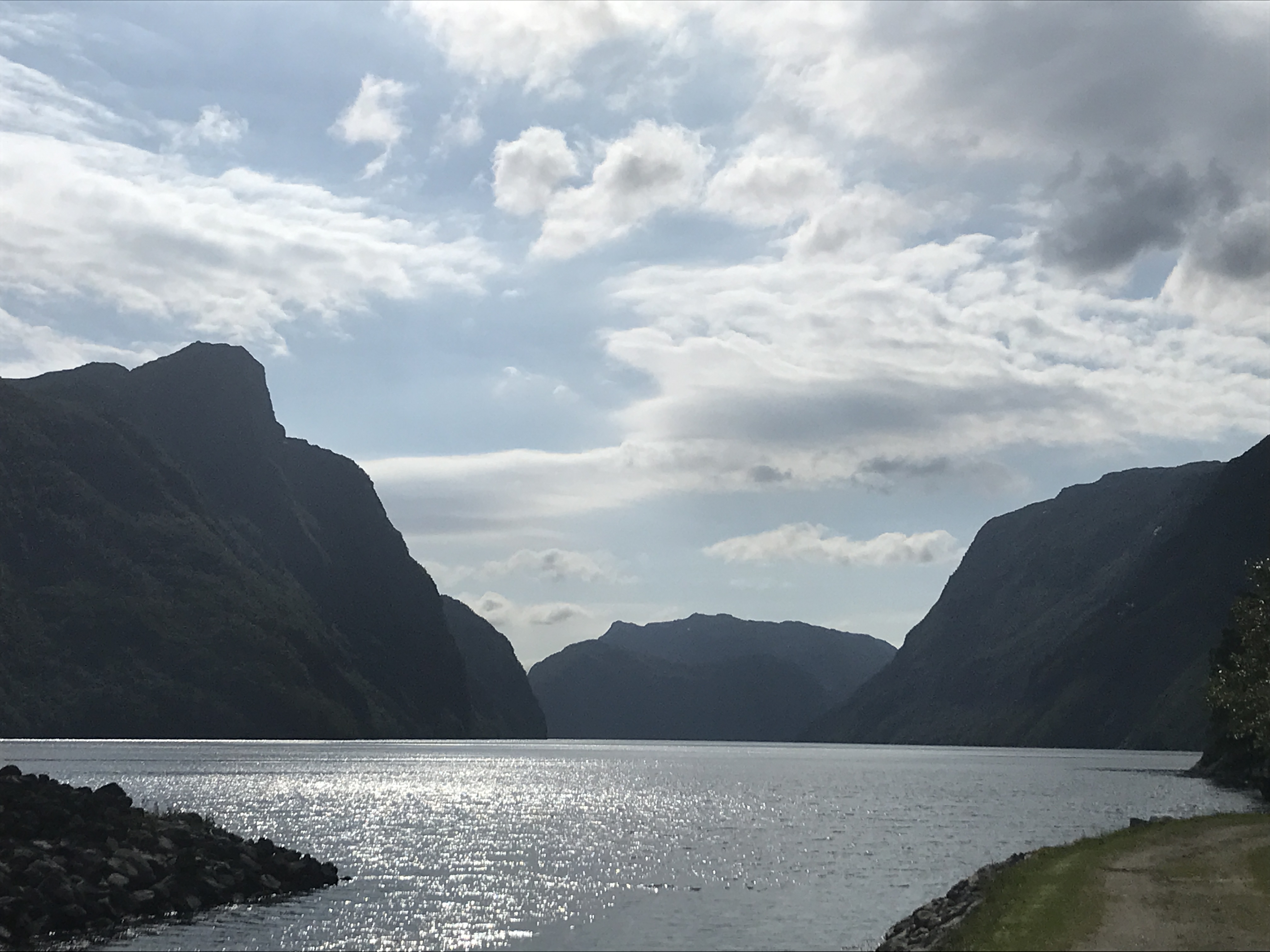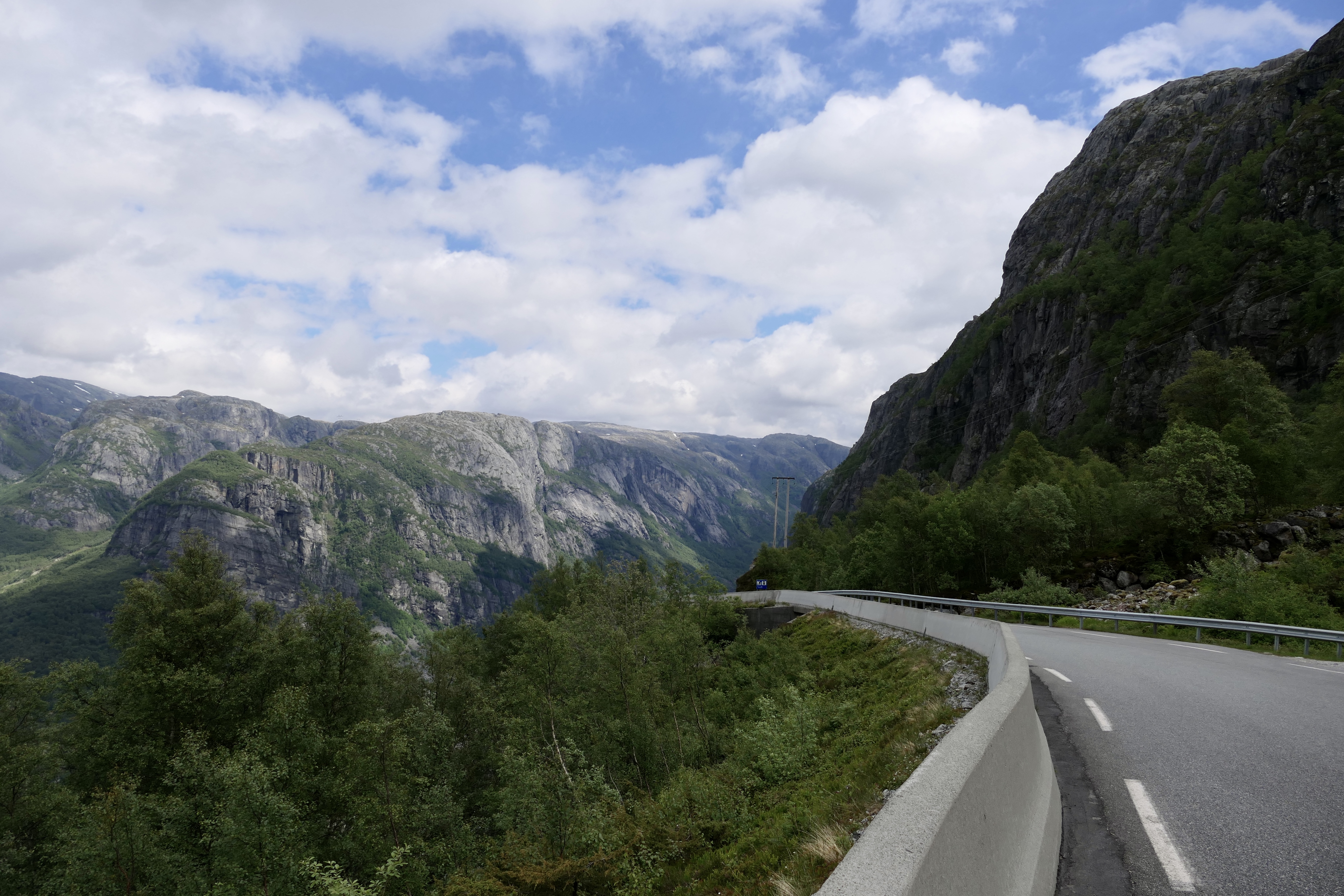 Wir fuhren wieder gegen Westen und machten unterwegs einen Abstecher zum Lysefjord. Der Weg dorthin führt über 28 Haarnadelkurven und die letzte ist im 1.1 km langen Tunnel. Das Wetter war sehr abwechslungsreich, von kühl, neblig, sonnig, regnerisch bis sehr warm. Der Campingplatz liegt direkt am Frafjord und ist wunderschön.