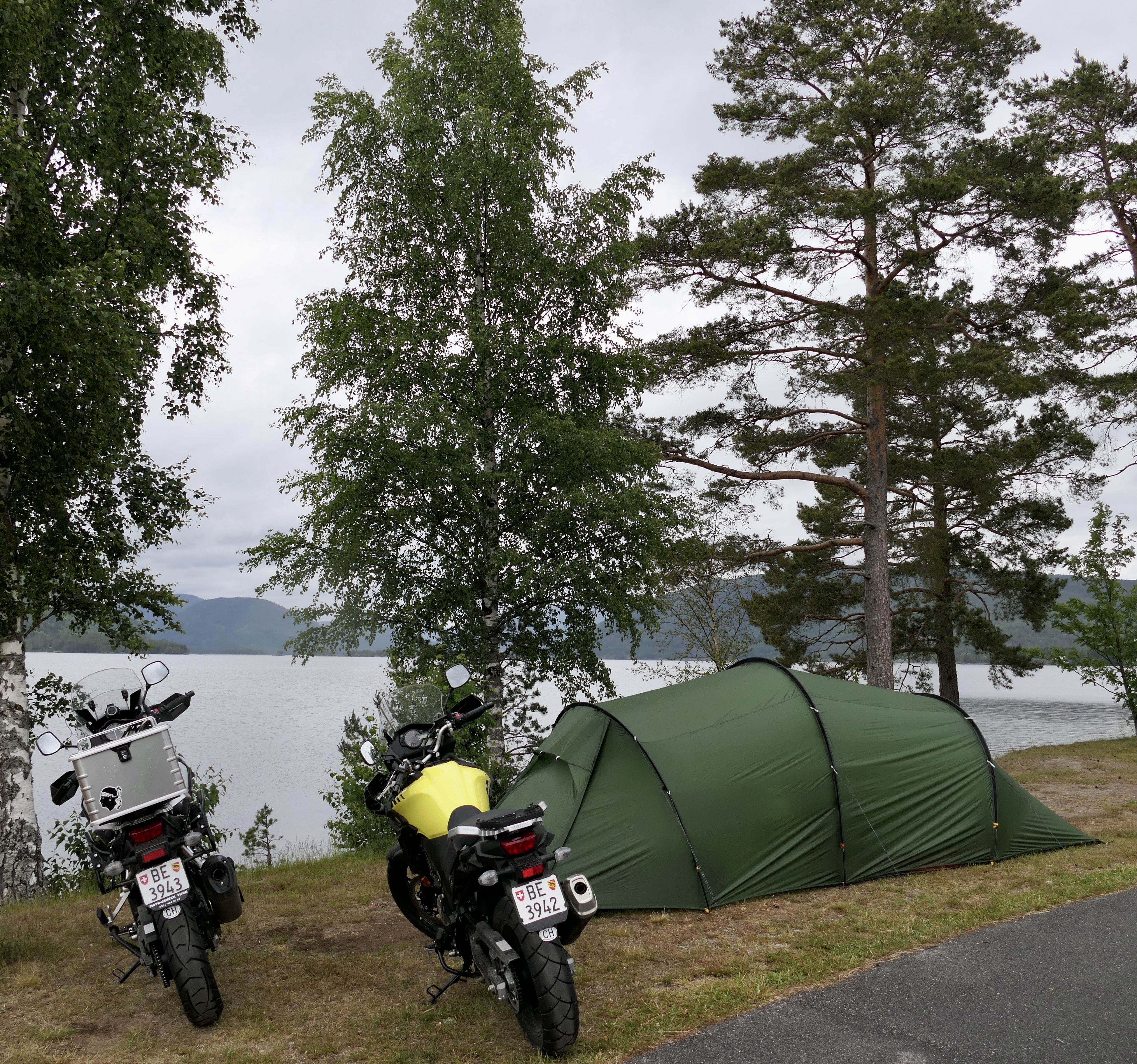Heute morgen hat es geregnet und wir mussten unser Zelt nass zusammepacken. Die Route nach Oslo war sehr schön und wir haben vieles erlebt: von leichtem Regen, über Baustellen bis Holperstrassen und zum Schluss sogar noch Kurven – aber erst in Norwegen 🙂