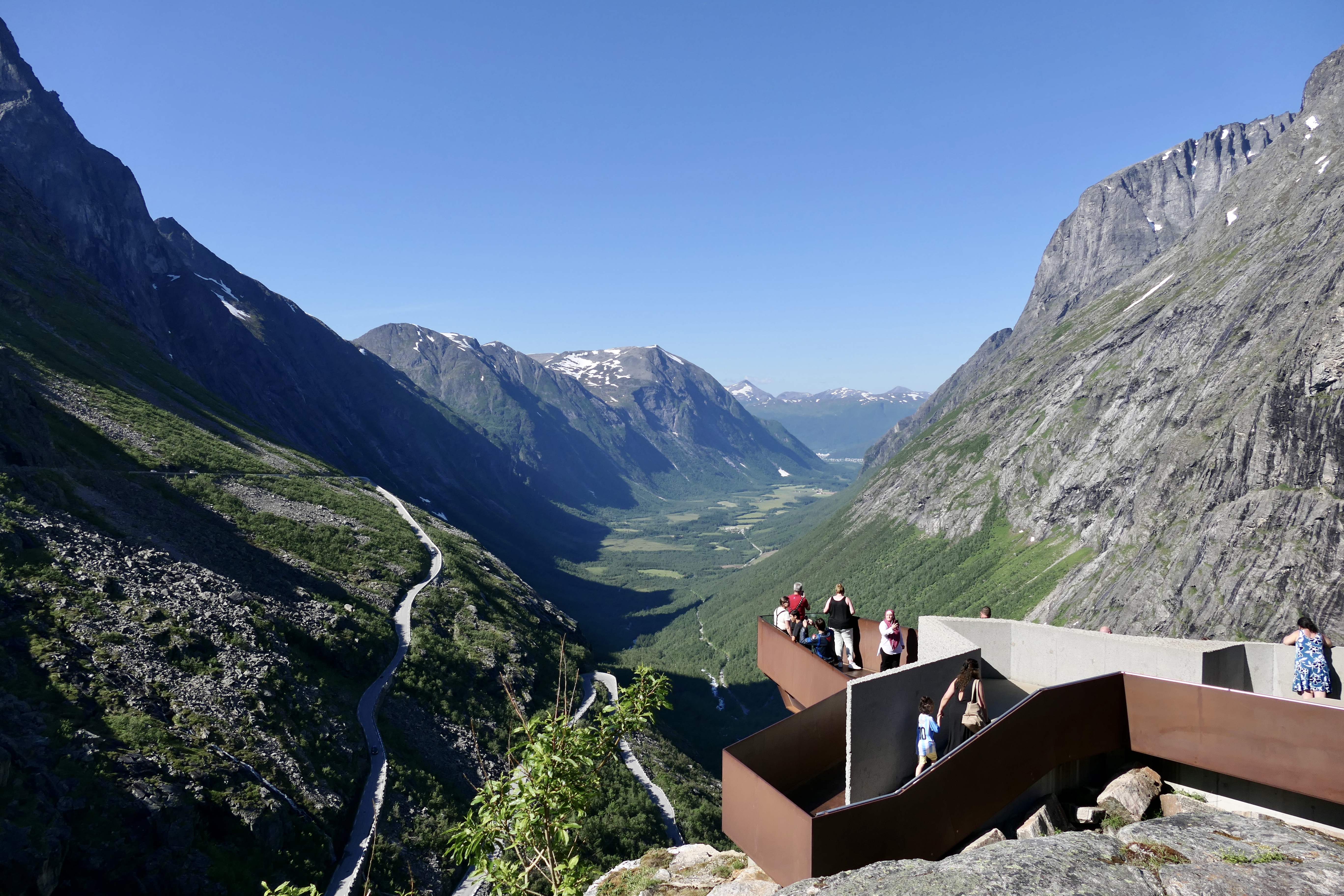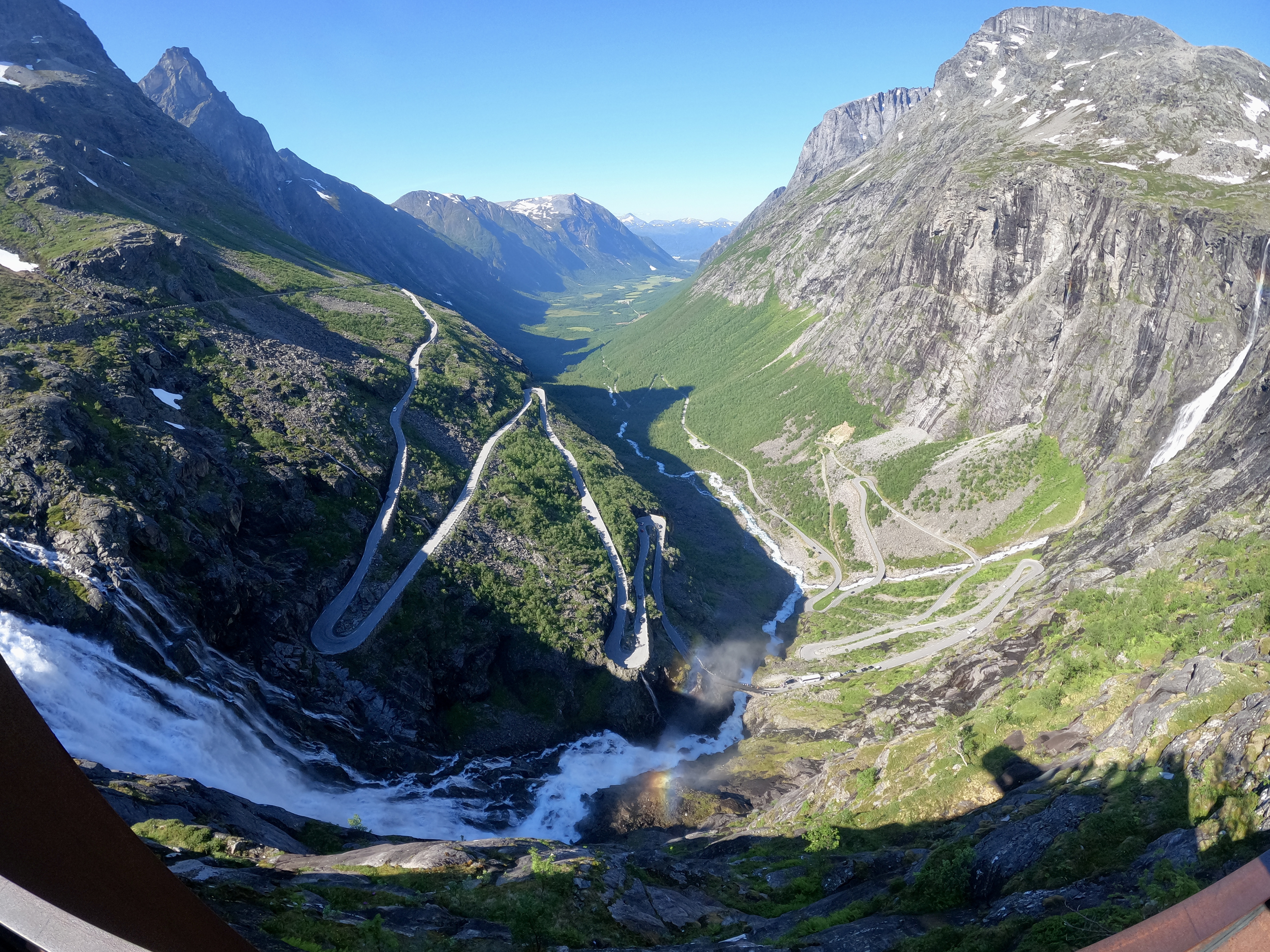 Fast am Ende unserer Tagestour kamen wir dann noch zu den Trollstigen. Dort hat es ein modernes Touristenzentrum mit einer Aussichtsplattform zum Stigfossen Waserfall. Danach geht’s dann über 12 Haarnadelkurven nach Andalsnes.